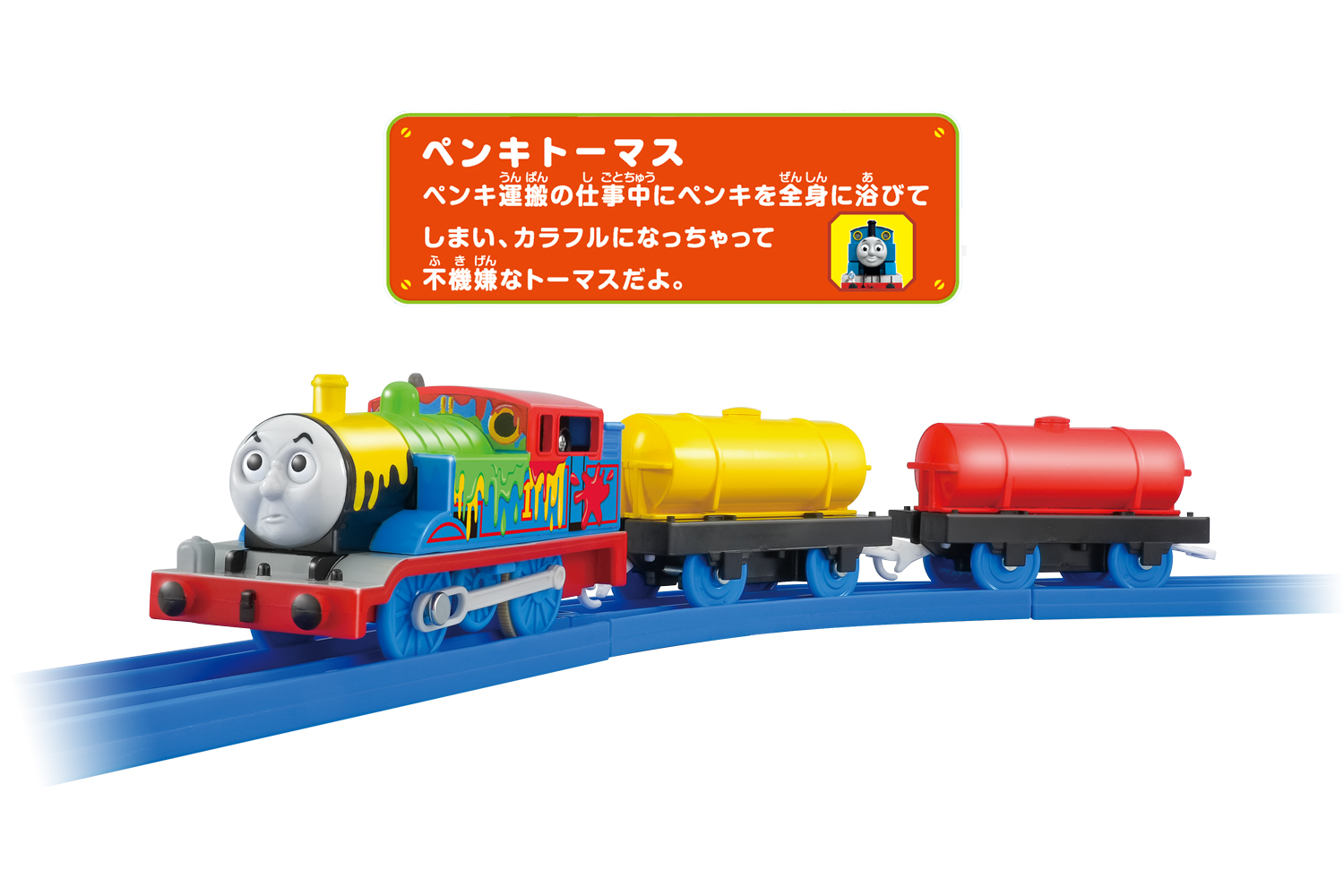 ペンキ運搬の仕事中にペンキを全身に浴びてしまい、カラフルになっちゃって不機嫌なトーマスと、